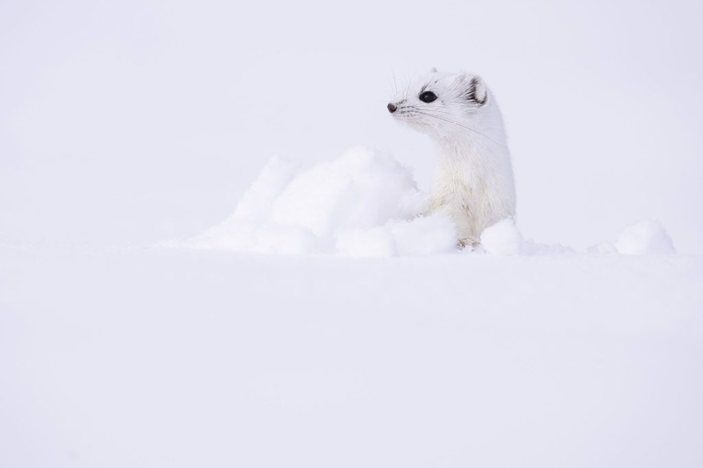 Elle creuse des tunnels sous la neige et ressort ici ou là pour observer autour d’elle ce qu’il se passe lors de sa chasse aux campagnols dans les champs.